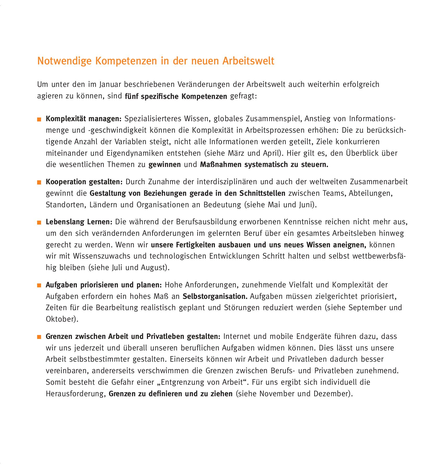 Globalisierung, Digitalisierung und Informationszuwachs verändern die Grundstrukturen des Arbeitens für zahlreiche Beschäftigungsgruppen. In diesem Kalender erfahren Sie, welche Auswirkungen diese Entwicklungen mit sich bringen und erhalten Anstöße für den Umgang mit den Anforderungen der „neuen Arbeitswelt“.