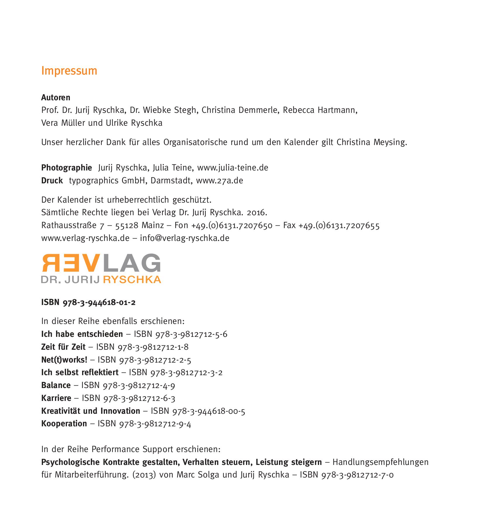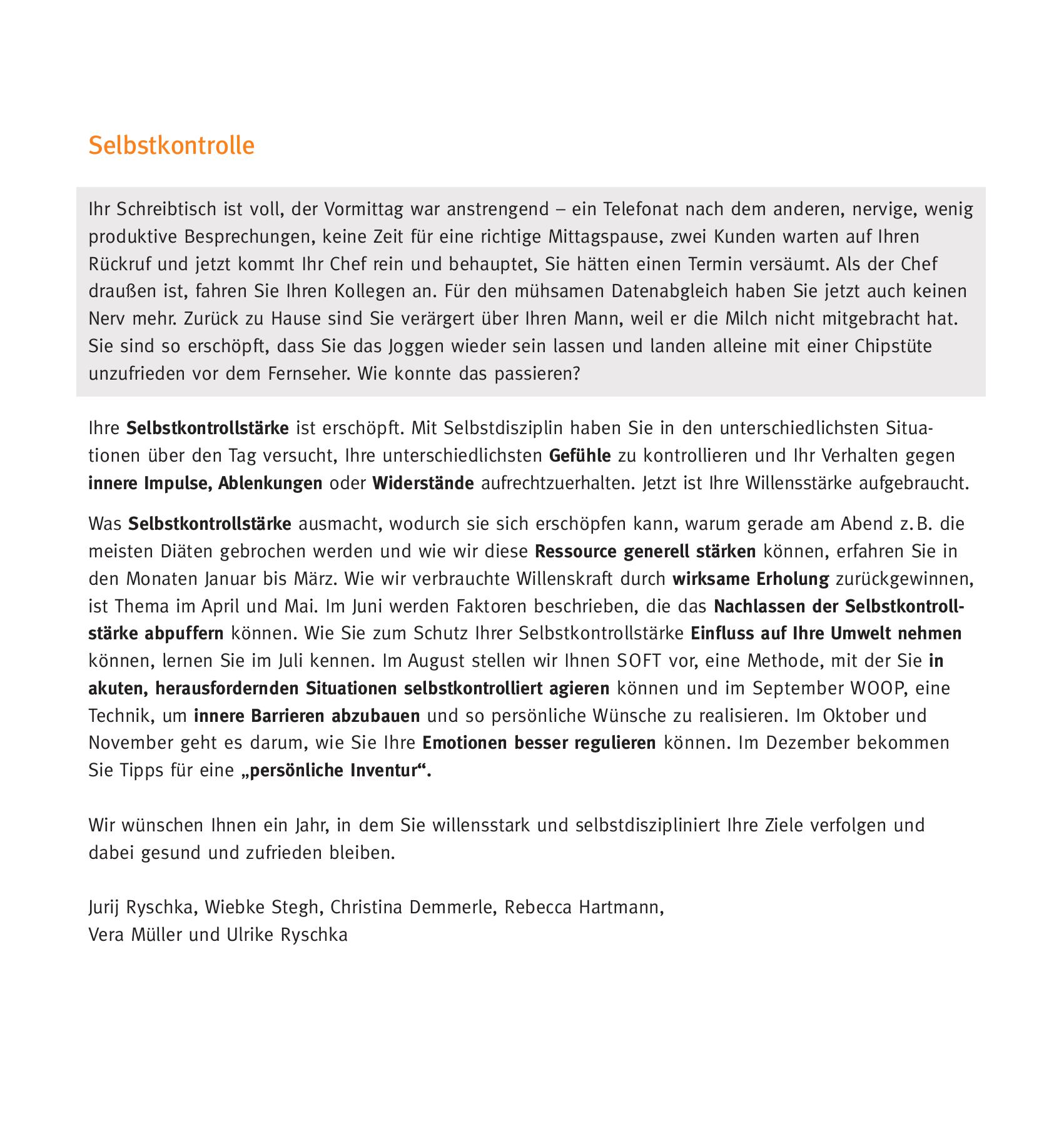 Tag für Tag müssen wir in den unterschiedlichsten Situationen unsere Gefühle kontrollieren und inneren Impulsen und Ablenkungen widerstehen. In diesem Kalender erfahren Sie, wie Sie Ihre Selbstkontrollstärke aufrechterhalten und durch den Einsatz verschiedenster Methoden ausbauen können.