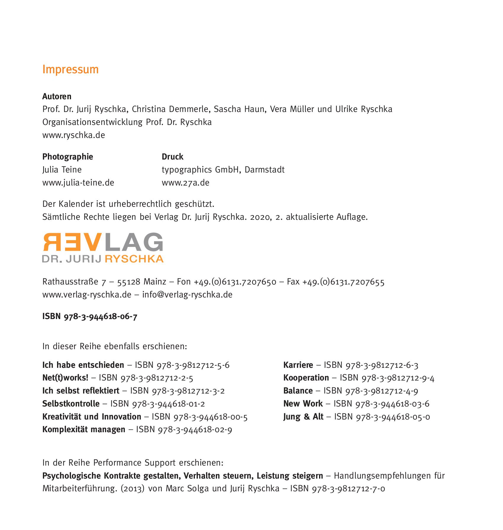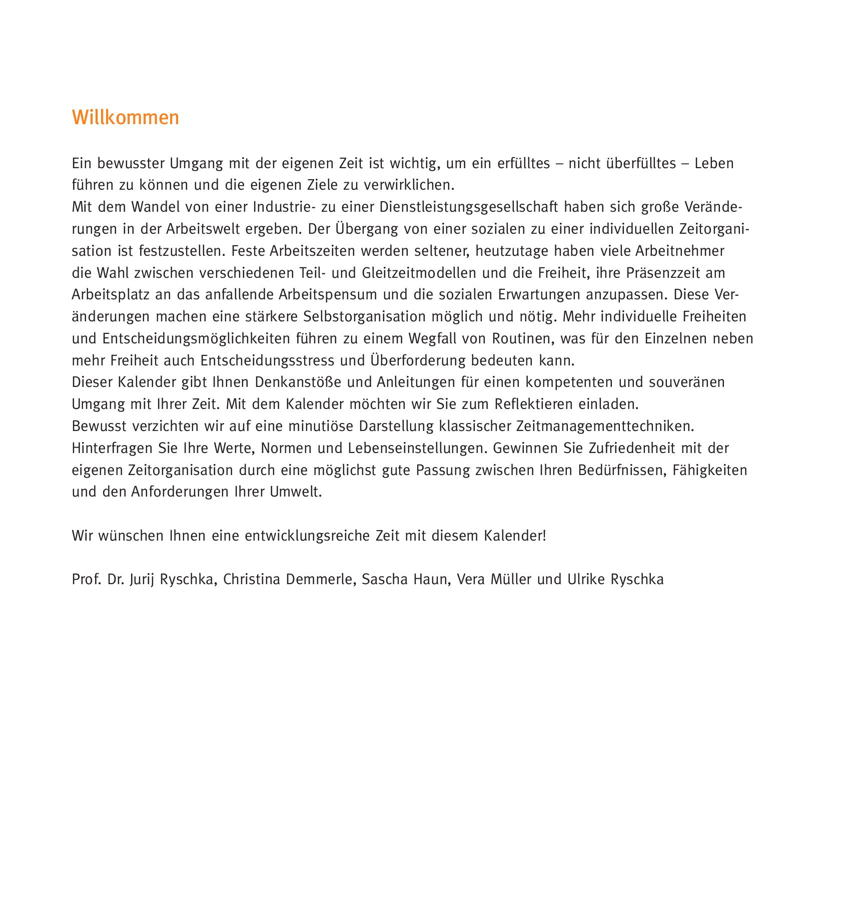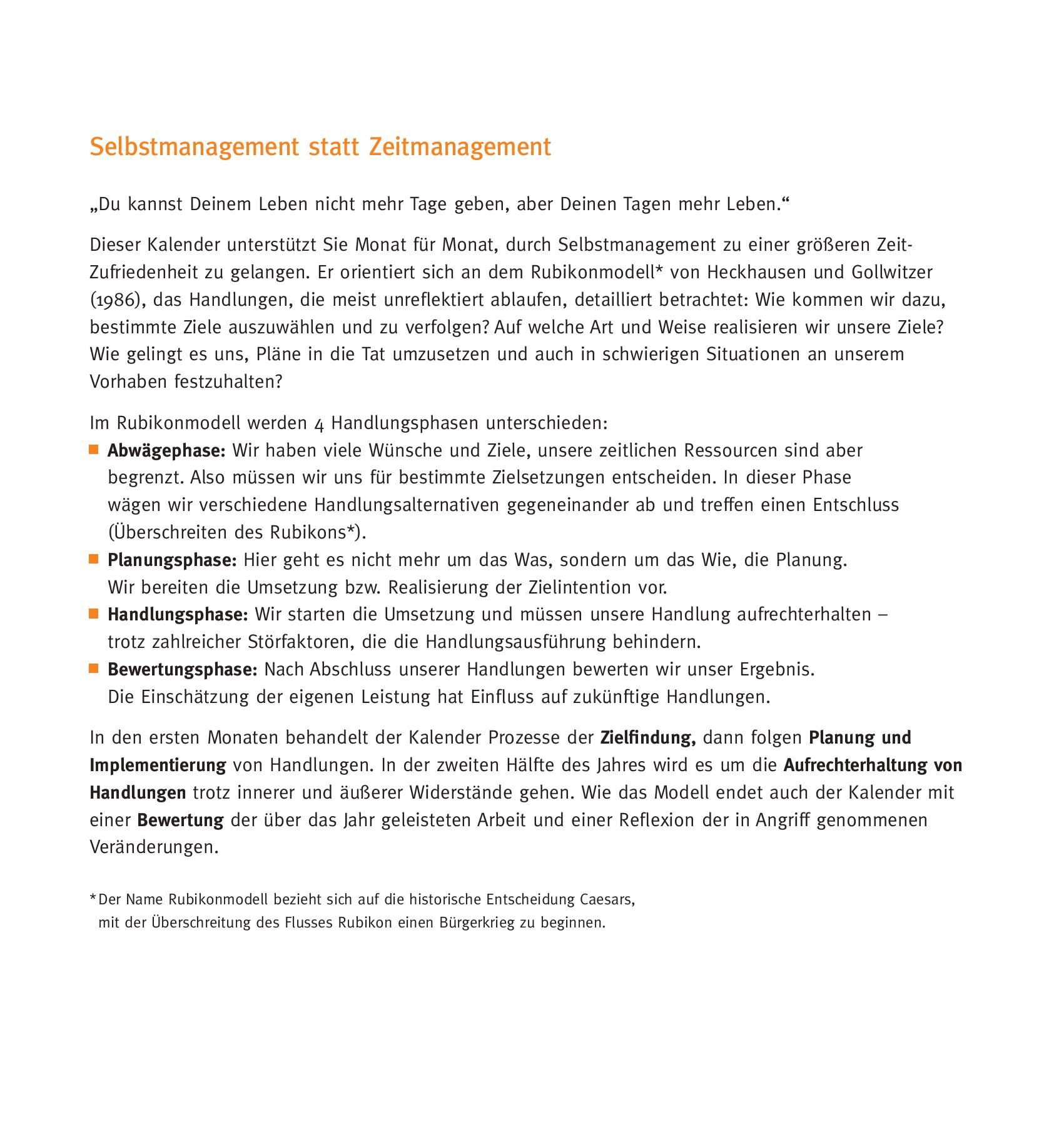 Ein bewusster Umgang mit der eigenen Zeit ist wichtig, um ein erfülltes – nicht überfülltes – Leben führen zu können und die eigenen Ziele zu verwirklichen. Der Kalender gibt Ihnen Denkanstöße und Anleitungen für einen kompetenten Umgang mit Ihrer Zeit auf Basis aktueller Forschungserkenntnisse. Gewinnen Sie Zufriedenheit mit Ihrer Zeitorganisation.